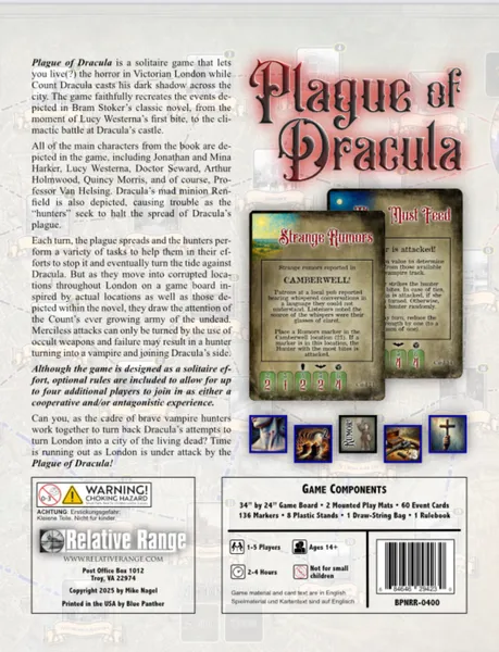 Plague of Dracula is a solitaire game that lets you live(?) the horror in Victorian London while Count Dracula casts his dark shadow across the city. The game faithfully recreates the events depicted in Bram Stoker’s classic novel, from the moment of Lucy Westerna’s first bite, to the climactic battle at Dracula’s castle.