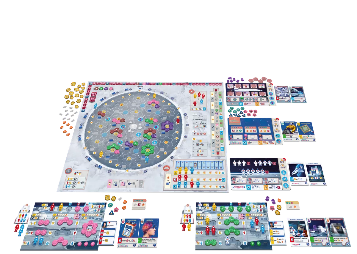• Action phase: Players take turns deploying their astronauts on the moon to collect resources, build structures, or fund projects. Depending on which corporations were selected, different types of resources will be available, resources that can be used in various ways for the projects or to build structures. Each project provides ongoing abilities and scoring opportunities. Each corporation provides different ways to score points, which could be during the action phase, the maintenance phase, or at game’s end.