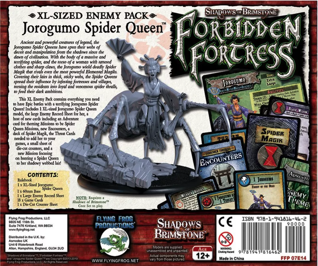 This pack comes with 1 miniature and all of the cards and rules needed to use the Jorogumo Spider Queen enemy in your Shadows of Brimstone adventures. It also includes one new mission.