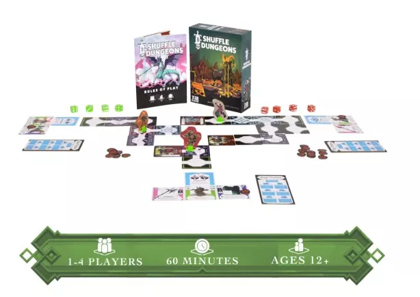 Shuffle Dungeons is a cooperative dungeon crawler for 1-4 Players. All players work together to fight monsters, build a route through the dungeons, and fight the boss waiting in their lair.