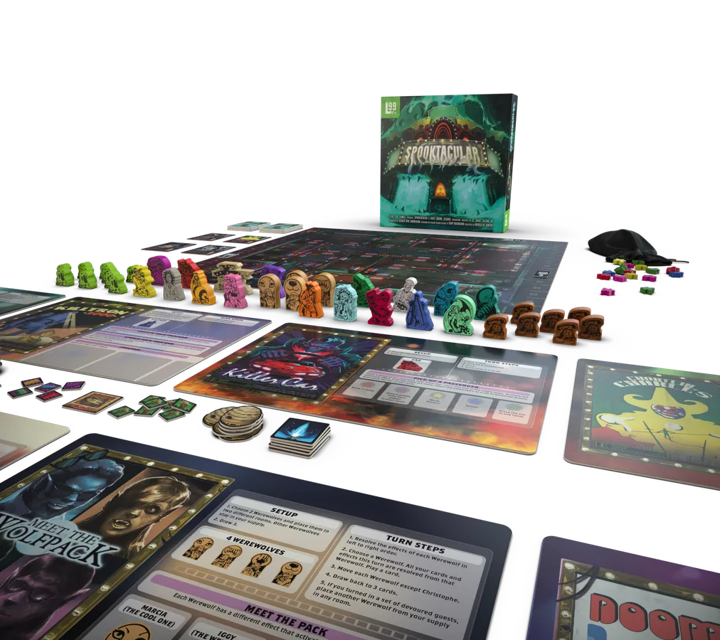 Spooktacular is played over a series of rounds. Players perform the turn steps on their monster in order, then pass the turn to the player to their left. Playing cards, adding guests, moving, spooking, devouring, and interacting with your monster’s unique abilities are common things you might do on a turn