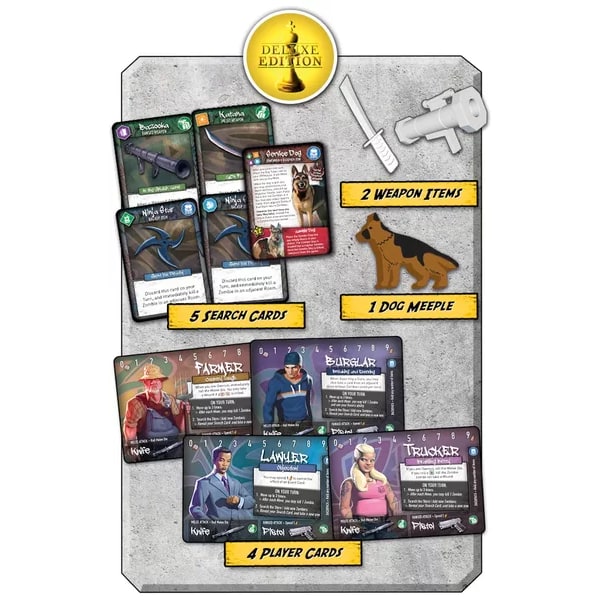 This promo pack includes the Deluxe content offered for Tiny Epic Zombies during its Kickstarter. It includes: 4 playable characters – the Burglar, the Lawyer, the Farmer and the Trucker. 5 search cards – the Service Dog, the Katana,the Bazooka and 2 Throwing Stars. 2 ITEMeeple items – the Katana and the Bazooka 1 wood Dog meeple