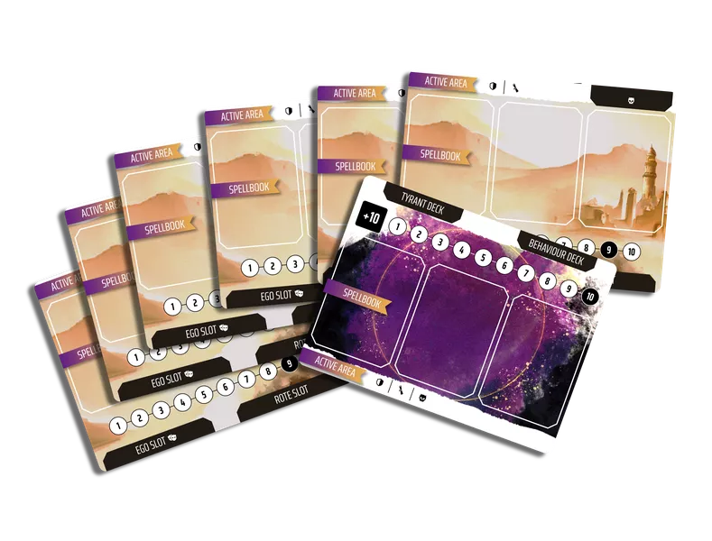 Tyrant Hunt is the co-operative expansion to the tactical card game, Chroma Arcana. Players take on the roles of fledgeling mages, using their knowledge of the arcane arts to outmanoeuvre and defeat the Tyrants they hunt. Each mage has access to a unique combination of Spells based on their chosen colours of magic, allowing for a diverse range of gameplay options and strategeies. The goal of the game is to reduce the Tyrant’s health to zero before they escape! On your turn, you can place Spell cards into your Spellbook. Then, you can discard cards of a matching colour to charge those Spells up. Once a Spell is charged up, it must be cast.