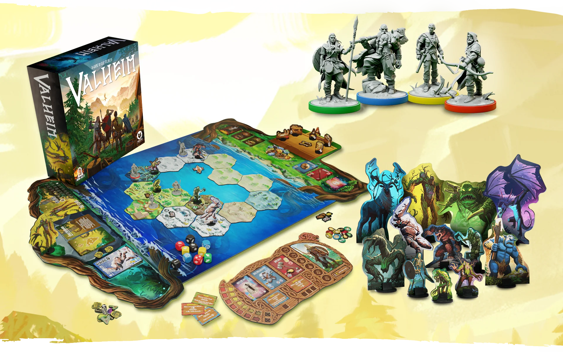 Valheim is a co-operative board game in which survival depends on teamwork and strategy. Gather your fellow companions and venture forward to explore, build, collect resources, forge weapons, equip sturdy armor, battle enemies, and carve your path towards facing the ultimate evil. Take on a role in which you help tailor the adventure to your liking. The fate of everyone lies in your hands!